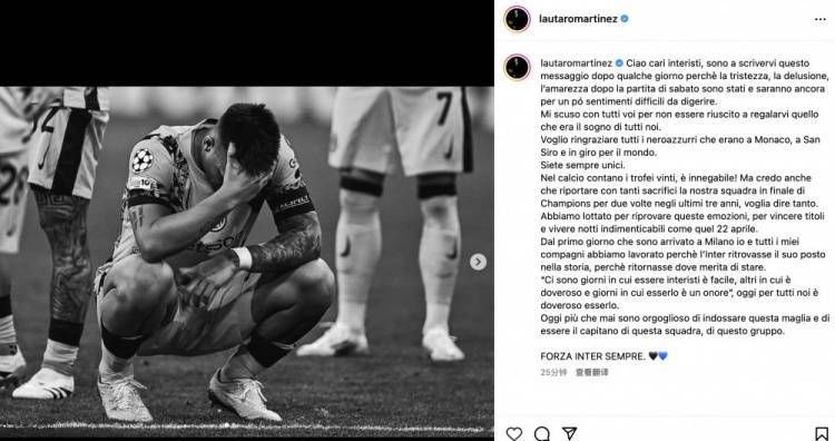 直播吧6月5日讯 国际米兰在欧冠决赛中5球惨败巴黎,无奈吞下本赛季四大皆空的苦涩。国米队长劳塔罗更新社交媒体发长文致歉蓝黑球迷,言辞情真意切,令人动容。