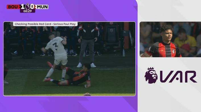 直播吧4月28日讯 英超第34轮曼联客场1-1战平伯恩茅斯,第69分钟主队球员埃瓦尼尔森铲倒马兹拉维,主裁判出示黄牌,但是观看回放后改判红牌。这一判罚引发了争议,前英超裁判德莫特-加拉格尔和两位评论员对此发表了看法。